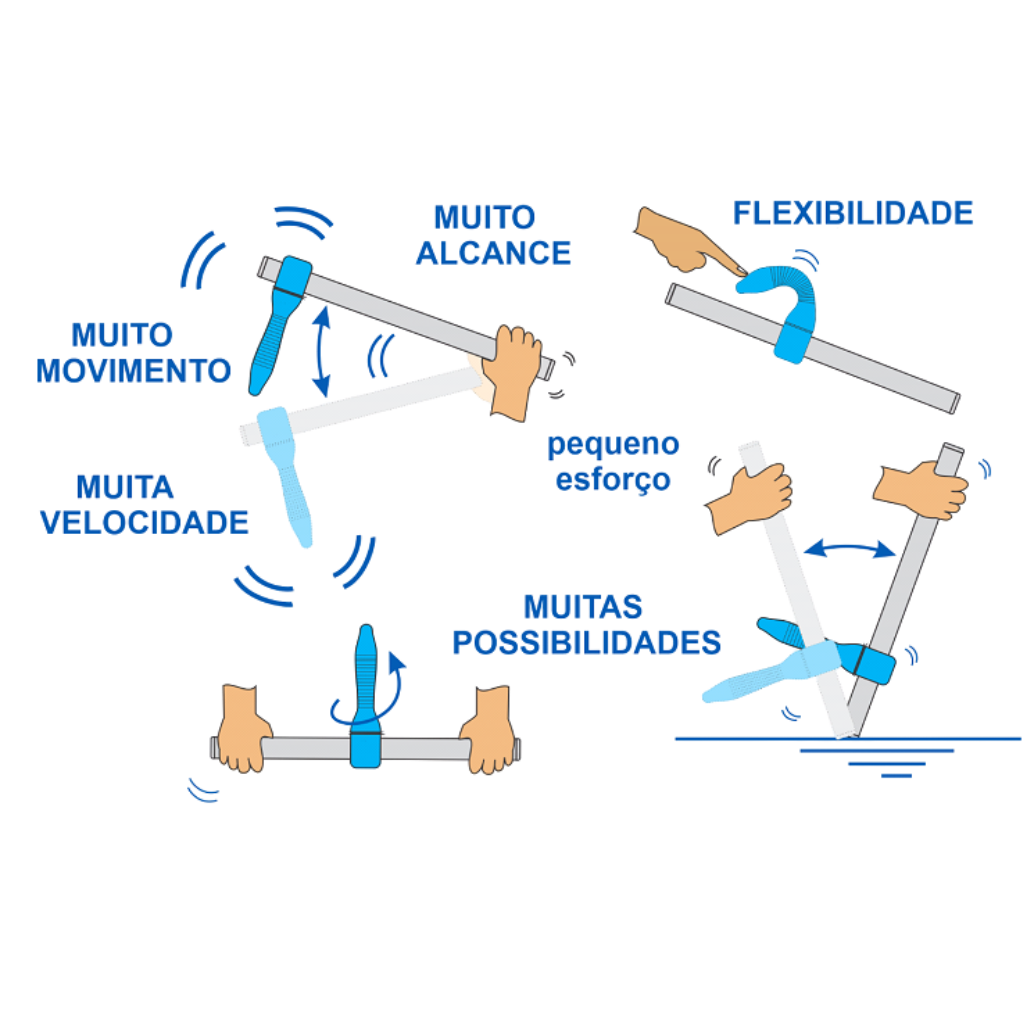 Kucomblue dobra o alcance do braço e cria uma segunda articulação, multiplicando as possibilidades, as posições, os movimentos, a velocidade, as sensações e as percepções. Tudo com menor esforço e maior conforto.